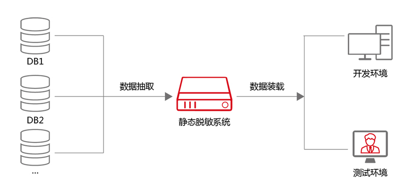 静态数据脱敏系统直接连接生产与开发测试环境,部署网络拓扑如下图所示:
